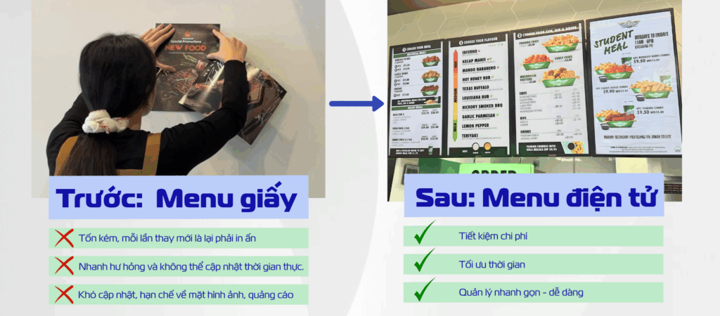 – Chi phí đầu tư ban đầu cao: Màn hình, thiết bị phát và phần mềm quản lý cần ngân sách lớn hơn menu giấy.