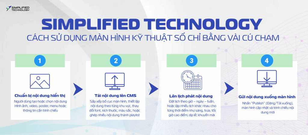 Để vận hành màn hình kỹ thuật số, doanh nghiệp thường sử dụng một hệ thống gồm màn hình, thiết bị phát nội dung (media player) và phần mềm quản lý nội dung (CMS). Quy trình sử dụng cơ bản gồm các bước sau: